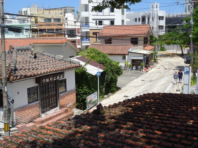 《 赤瓦屋根の住宅ものぞく、壺屋やちむん通りの風景 》